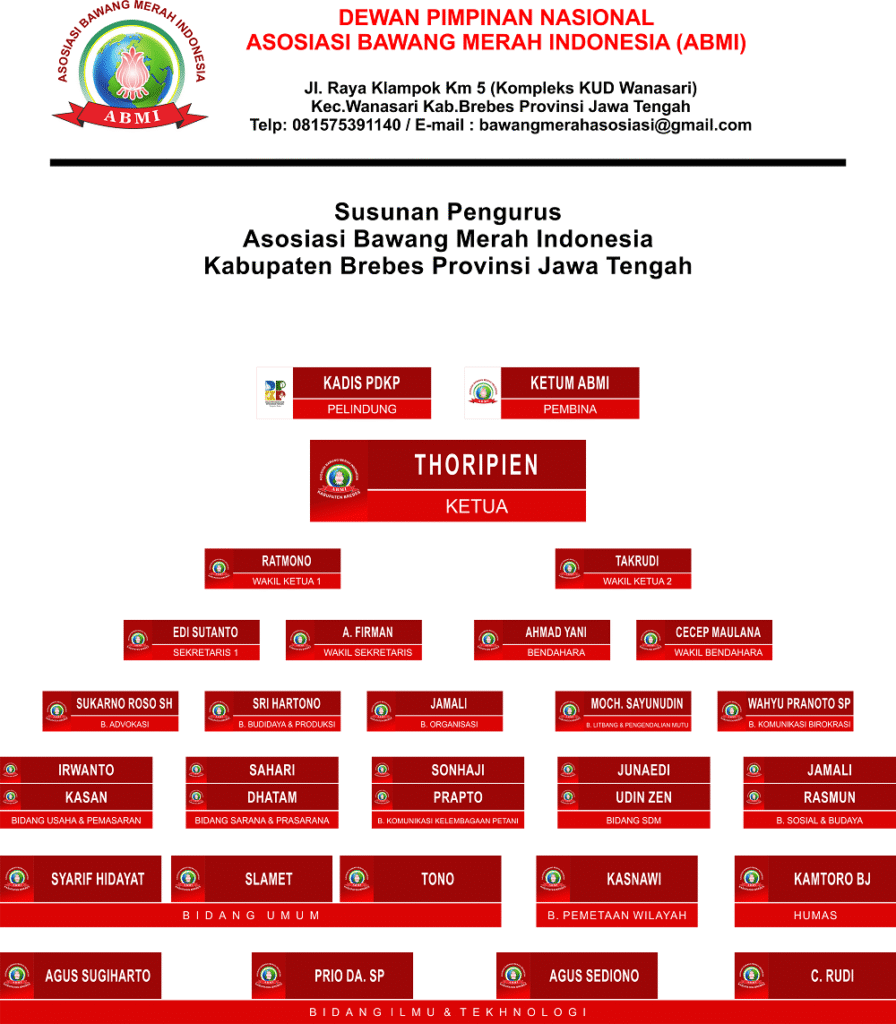 Kepengurusan Asosiasi Bawang Merah Indonesia (ABMI) dibentuk sebagai wujud komitmen bersama dalam mewujudkan organisasi yang profesional, transparan, dan berorientasi pada kemajuan petani bawang merah di seluruh Indonesia.